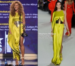 Celebrities are always front and center at the world's greatest fashion shows. So it's no wonder that they sometimes show up on red carpets and on stage in designs ripped right from the runways. Beyonce' looks even better than the fashion model in this Stephane Rolland design!