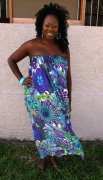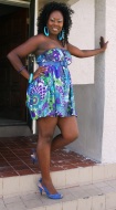 In Look #2, she removed the shirt and wore the dress tube style and flowy. She added big bangles, hoop earrings and blue flip-flops for a more casual look that she could sport on the beach or just lounging. For her final look, she simply tucked the bottom of the dress to create a bubble hem mini-dress, added a belt to cinch the waist, large earrings and a pair of royal blue pumps. With this look she is ready for a night on the town. Toddra shows the versatility of this one fabulous dress!