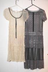 (CINDY PULLS TWO INTRICATE SHEER LACE DRESSES. SHE TELLS ME THAT SHE GO AT DKNY WHEN SHE AS CORPORATE APPAREL DESIGN DIRECTOR, ALMOST A DECADE AGO.)