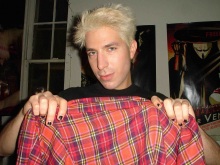Originally black-shagged Krelenstein, changes his hair more than a suicide blonde. He’s the ham of the bunch. NYU graduate, twenty-seven, and Pisces. We find him clowning around in a yellow and black Jeremy Scott sweater. |