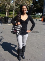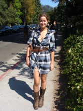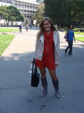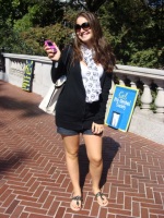 Cal men are much more understated, choosing mostly iconic “Cal” logo gear, or styled jeans with a fantastic t-shirt or cool dress shirt with flair. Of the guys who use fashion to express themselves, we saw 80s a la Johnny Depp in “21 Jump Street”. We spotted one student who accessorized her mini-skirt, blouse and tights with big pink headphones so she could study in the sunshine in style. And, MyCloset.com approached one, tall student in those high-waisted trousers, favored by retailers right now, but she was running to class and too busy to pose! |